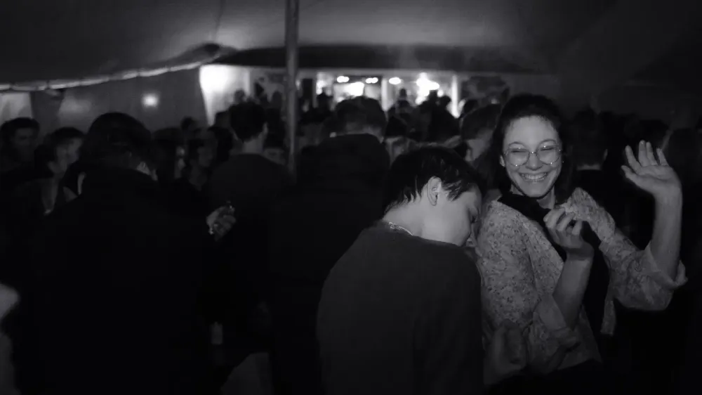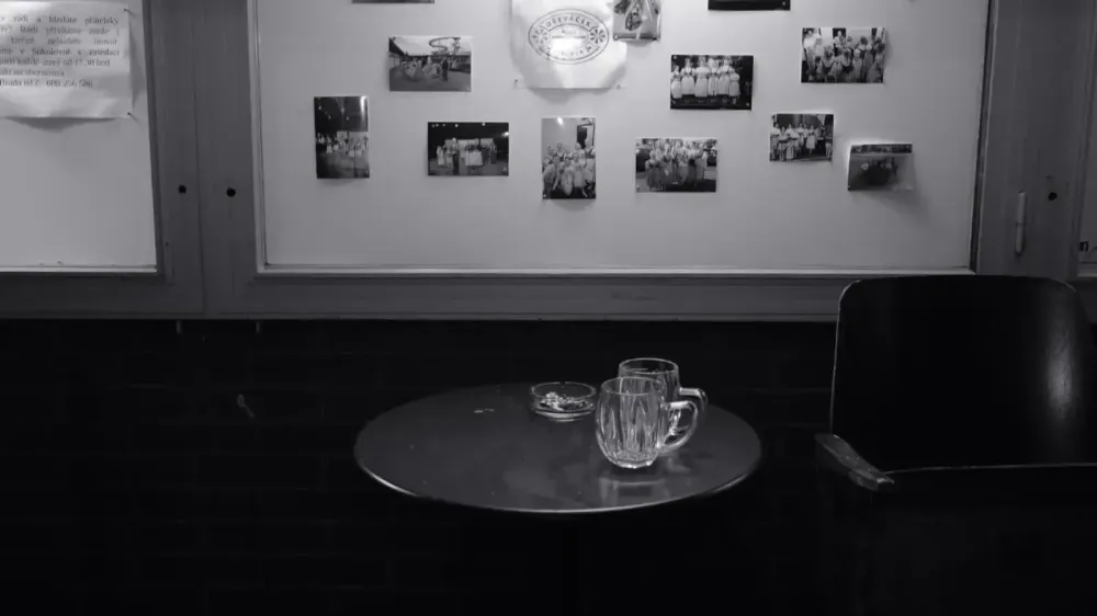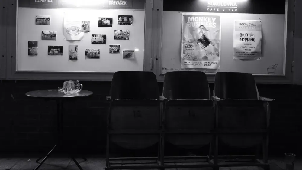А після довгих сеансів кіно, ввечері, відвідувачі також мають змогу послухати музику наживо або ж випити келих вина у славнозвісному барі «Sokolovna». Слідуючи білою лінією потрапляєш до входу у бар, біля якого видніються старі сидіння з кінотеатру. Сидячи на них, ми спостерігали за тим, як густий туман ковтав людей, але водночас приводив до нас нових. І в якомусь сенсі тривало живе кіно, в якому відвідувачі крутилися й літали, наче жовте осіннє лисття. Вино і пиво розливалося, а розмови не вщухали. Коли ж туман вирішує усіх провести додому, то у барі залишається лише своєрідний натюрморт.