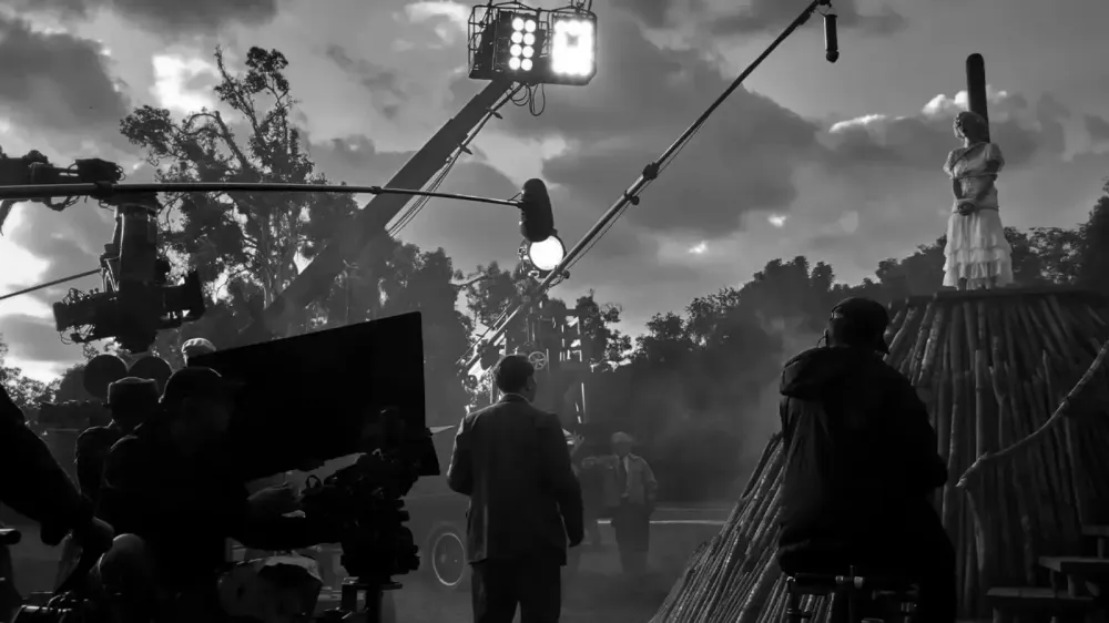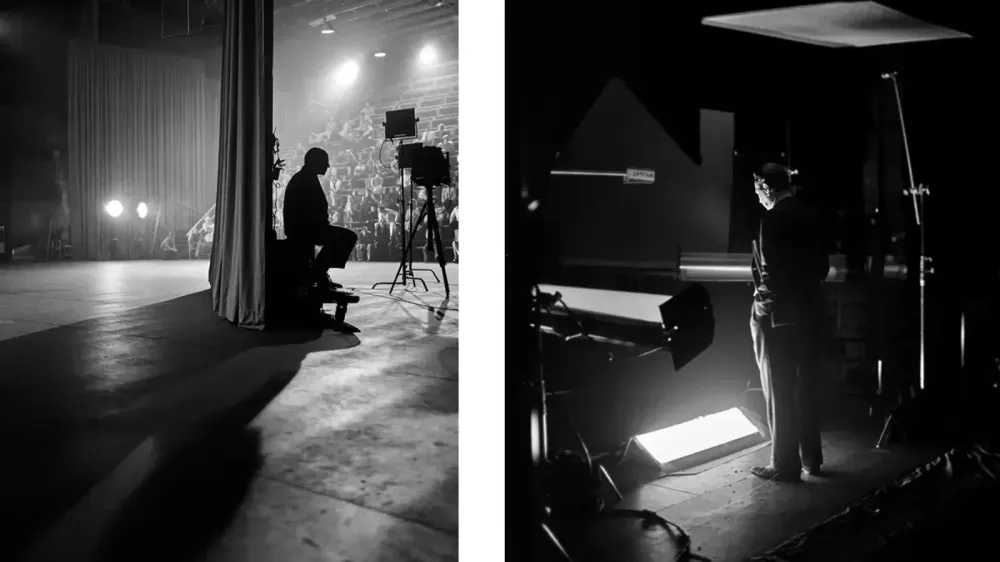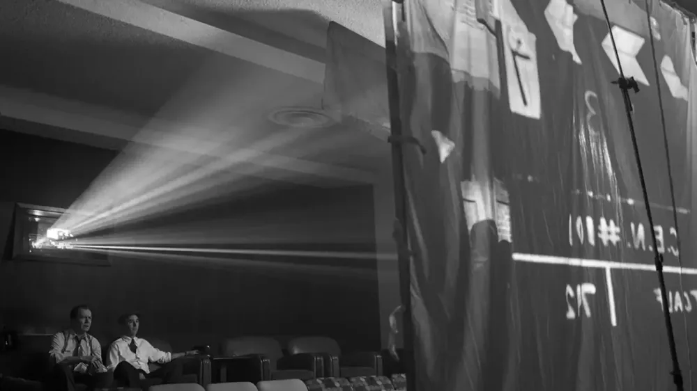 Ми спостерігаємо за чорно-білим світом індустрії кіно, світом продюсера та директора, актрис та акторів, режисерів і сценаристів, набитих до коридорно-кімнатних цехів, які сперечаються про швидкість падіння папірця, що летить на підлогу. Ми дивимось кіно про кіно.