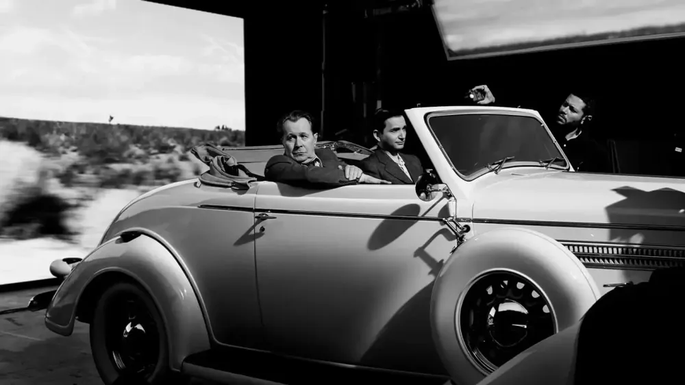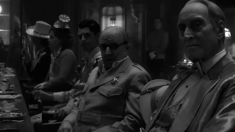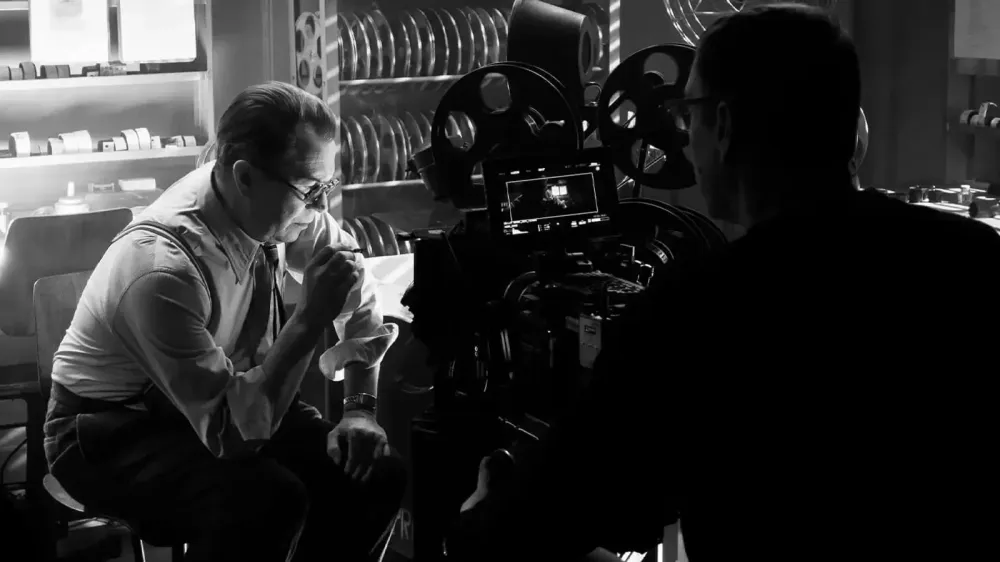 У “Манку” ми слідкуємо за акторами, і не тільки акторами фільму “Манк”, але й акторами у фільмі “Манк” як персонажами, яких вони грають. Актор, по суті, стає кимось іншим, грає роль, але водночас залишається собою як особистість. У “Манку” актори грають роль акторів, тобто грають роль тих, хто грає роль. І інша ситуація: режисер Веллс, персонаж фільма, як режисер дистанційований від кіно як кіно, бо є його творцем, залученим до нього з боку виробничої реалізації, але він виступає й головним актором власного фільму. Водночас, за незримою стіною присутній і сам Девід Фінчер, режисер “Манка” — фільму у тому числі й про те, як створюється кіно — і Фінчер діє у аналогічній ситуації, що й персонаж Веллса, хіба що не граючи якогось персонажа.