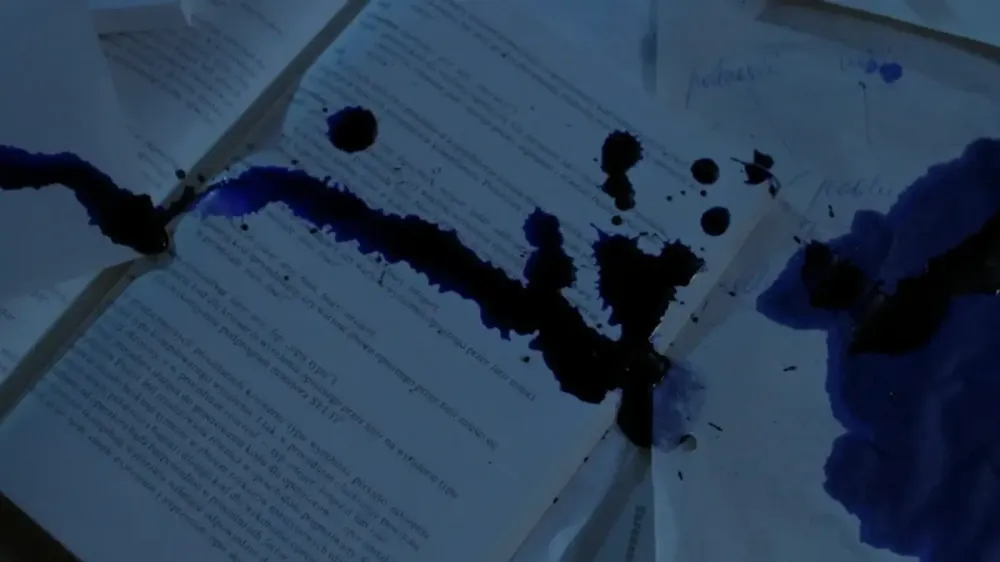 Кульмінація у фільмі починається, коли за столом у Кшиштофа тріснув скляний флакон. Чорнильна пляма яка з'являється як прикмета - не тільки проливається як «кров», але й забруднює руки Кшиштофа. На своїх лекціях в університеті головний герой Кшиштоф розповідав студентам про слова, мову та приховану в них метафізику – тут чорнило бруднить йому руки, і він намагається їх відмити – що, як відомо, дуже важко. Він ніби символічно намагався звільнитися від метафізики. Пізніше, у розмові з сестрою, коли Кшиштоф відчуває, що щось трапилося, він також каже, «без сенсу», що він розлив чорнило.