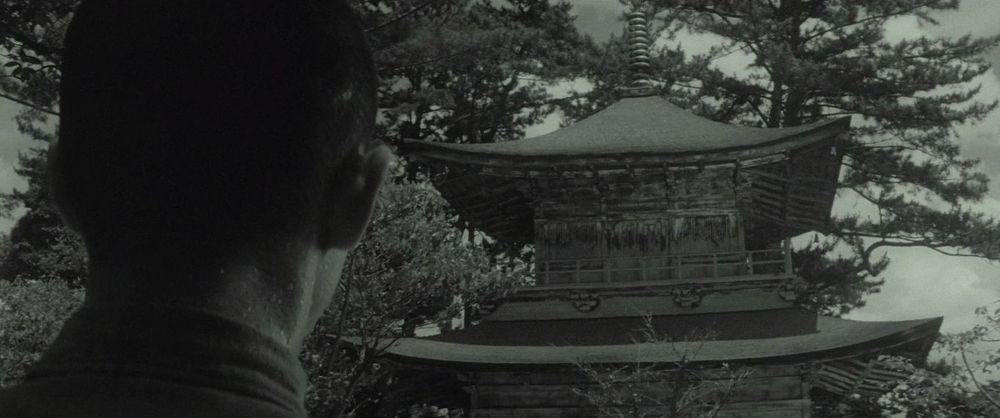 Кон Ічікава у своїй реалізації книги Місіми дуже чітко слідує першоджерелу, дбаючи не про колізії, а про принципи нарративу, принагідно звеличуючи кінематограф, як медіум, здатний не лише надати мові літератури конкретної подоби, а й значно поглибити її. Залишаючи осторонь сам тригер темпорального застигання в тексті оригінального твору — заїкання — режисер відтворює безпосередньо логіку кристалізації подібного образу — прийом флешбеку. Приклад: при першому своєму візиті в монастир при Золотому храмі Мідзогуті від перезбудження вкривається потом, фіксується в одній позі і пасивно переміщається туди-назад по власній лінії життя, конкретно в сцену свого першого святотатства і спотворення Прекрасного. Режисерський геній Ічікави тут проявляється навіть не стільки в бездоганній технічній однорідності переходу, скільки в побудові простору для (ви)падіння запалої літери Місіми, що дозволяє екзистенційним кульбітам твору само-загостритися до невпізнаваності. Цей ефект неможливості розпізнавання самого себе розширюється до меж способу нарації: Ічікава змінює перше обличчя на третє, попутно накладаючи на кожну нову ітерацію оповідача все більш товстий шар гриму. З таким же успіхом, режисер міг назвати фільм «Сповідь маски» (інший роман Місіми), і ніхто не помітив би каверзи. Тому що її немає…