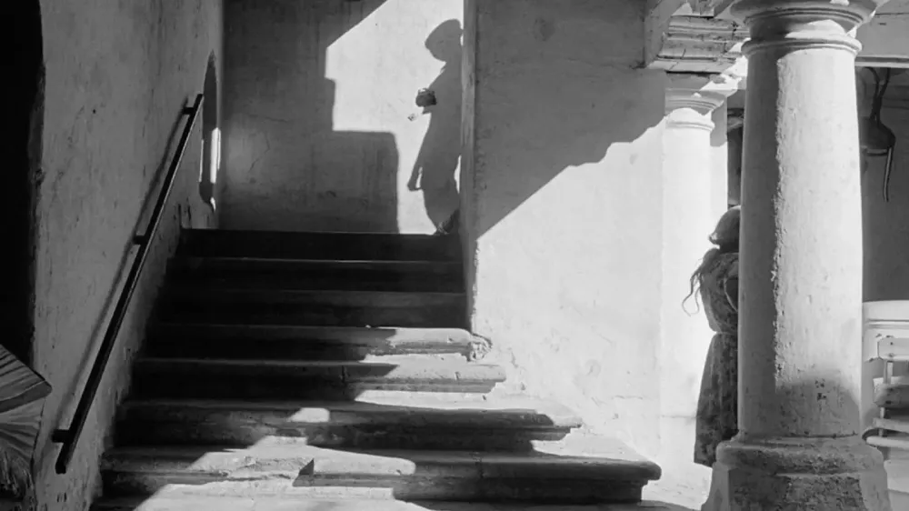 На чорно-білому прямокутному знімку ми бачимо насамперед масивну колону (в доричному стилі) і сходинки, які піднімаються вище середини знімка і потім звертаючи, ймовірно, піднімаються далі. Світло й тінь ділять знімок точно по діагоналі: від нижнього лівого кута до верхнього правого. За колоною ми бачимо спину жінки, на сходинках вище – людську тінь (ймовірно, підлітка), яка наче спускається по сходах (яких не видно). На сходах присутня лише тінь, людина ще прихована. У той час як внизу, біля колони, людина дана, але лише частково, зі спини. Між жінкою біля колони і тінню на сходинках починається гра – образи оживають, вони більше не байдужі один до одного. Як багато тут про людину. Здається, що тут розкривається багато чого про її суть. Людина тут – це результат гри між світлом і тінню. Тінь людини – це полуденний сон світлого дня, сама ж людина (зі спини) – це завжди "ось це", "щось там", за колоною. Можливо, в цій грі між світлом і тінню, що розкреслена простою, вивіреною симетрією, йдеться про певну подвійність буття людини? Ми виходимо з тіні, ми являємо себе лише як чиста присутність у світі і йдемо, так і не зустрівшись зі світом (лицем до лиця). На знімку немає обличчя людини, ми не зустрічаємося з нею очима. Вгорі є лише натяк, лише якийсь начерк людини, що може лише стати, втілиться. Внизу ж ми бачимо людину, яка, можливо, ховається від палючого сонця. Витримати яву буття неможливо. Людина – це сон тіні говорили древні. Можливо, ситуація розташувала об'єкти на знімку не випадково, і дорична колона тут – це сакральний знак того, що буття, яке вийшло з тіні спопелиться без захисту, без стовпа... без культури. Дорична колона – знак великої культури. Ви може бачити, що об'єкти на знімку Брессона, мають внутрішню динаміку. На статичному знімку ми бачимо живий рух образів. Тому творчість Брессона є чимось між (фото)графією і (кінемато)графією.